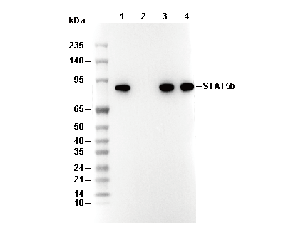 • Lane 1: HeLa, Lane 2: HeLa (KO STAT5B), Lane 3: Mouse heart , Lane 4: Rat heart