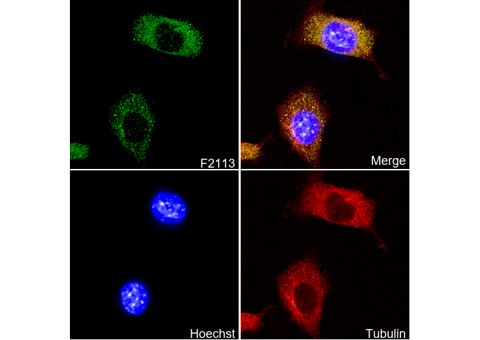 • Immunofluorescent analysis of NIH/3T3 cells using F2113 (green, 1:150), Hoechst (blue) and tubulin (Red).