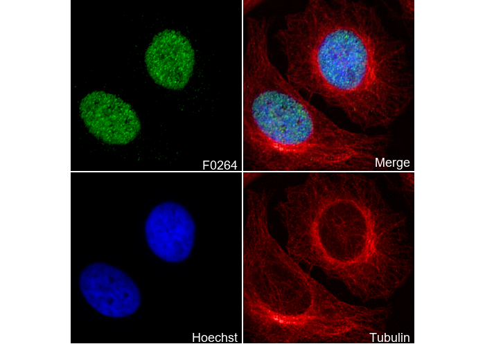• Immunofluorescent analysis of Hela cells using F0264 (green, 1:200), Hoechst (blue) and tubulin (Red).