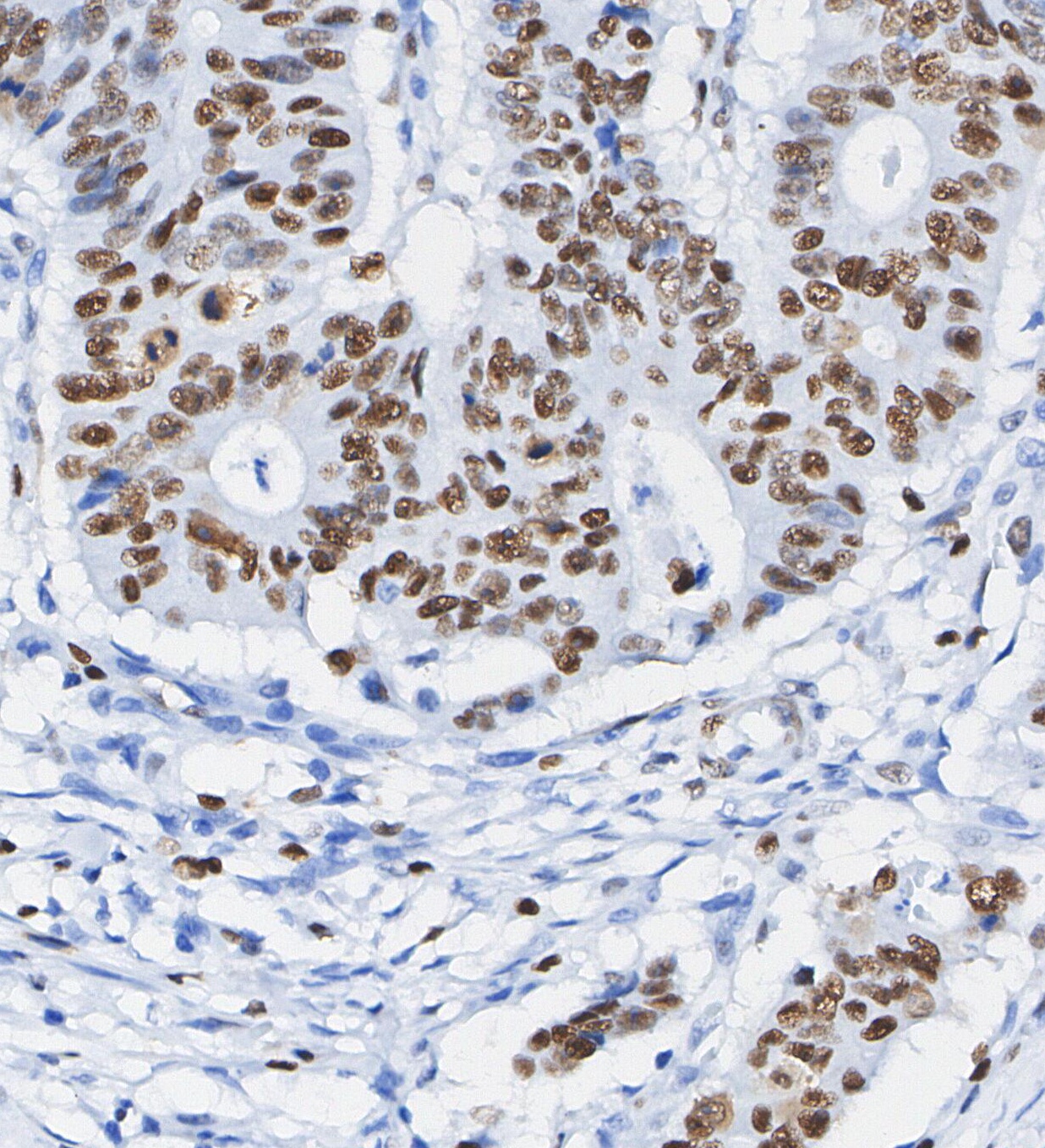 • Immunohistochemical analysis of formalin fixed paraffin embedded human Colorectal cancer tissue with F0264 at 1/200 dilution.