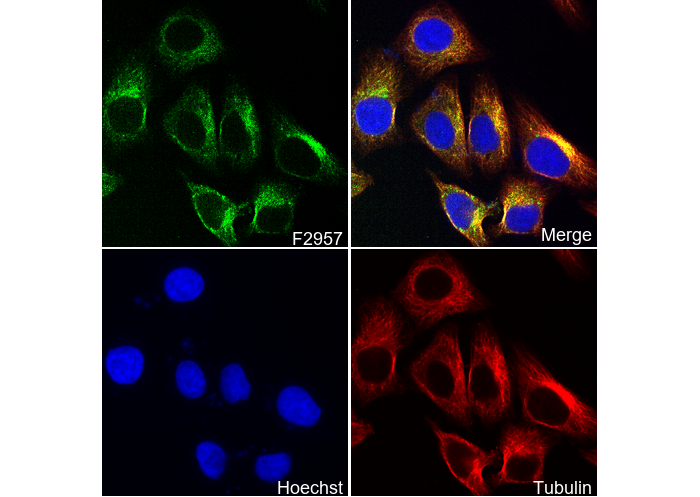• Immunofluorescent analysis of HepG2 cells using F2957 (green, 1:50), Hoechst (blue) and tubulin (Red).