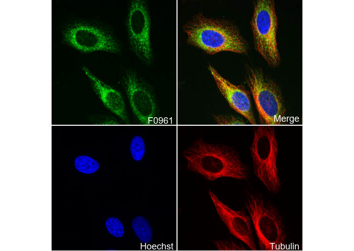 • Immunofluorescent analysis of Hela cells using F0961 (green, 1:3200), Hoechst (blue) and tubulin (Red).