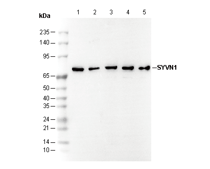 SYVN1 Antibody [J1J15] recognizes endogenous levels of total SYVN1 protein. This antibody does not cross-react with AMFR protein, but may cross-react with an unidentified protein of 60 kDa.