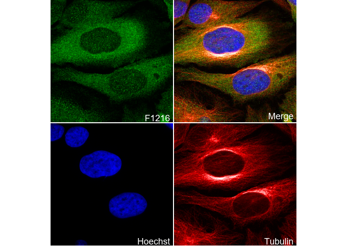 • Immunofluorescent analysis of Hela cells using F1216 (green, 1:200), Hoechst (blue) and tubulin (Red).