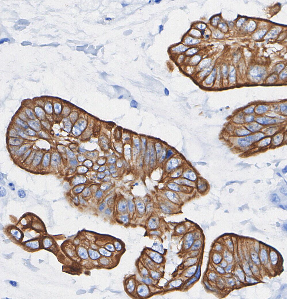 • Immunohistochemical analysis of formalin fixed paraffin embedded human Colorectal cancer tissue with F1216 at 1/100 dilution.