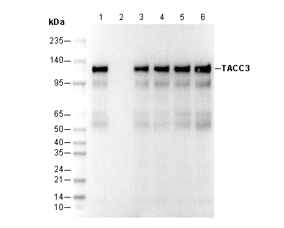 • Lane 1: HEK293T , Lane 2: HEK293T (koTACC3) , Lane 3: HeLa , Lane 4: HT-29 , Lane 5: Mouse testis , Lane 6: Rat testis