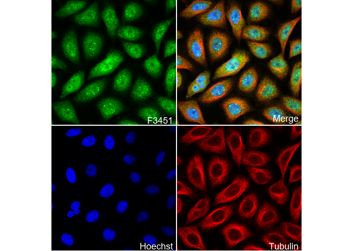 • Immunofluorescent analysis of MCF7 cells using F3451 (green, 1:100), Hoechst (blue) and tubulin (Red).