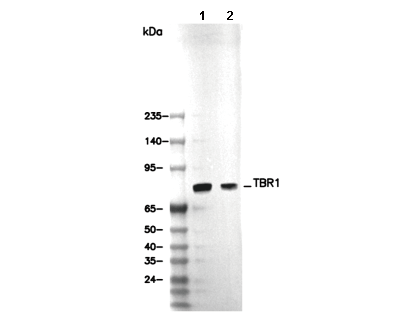 T-box brain protein 1 (TBR1) is a transcription factor that plays a crucial role in vertebrate embryonic brain development. As a member of the T-box family of transcription factors, TBR1 is specifically expressed in postmitotic glutamatergic projection neurons. During the formation of the cerebral cortex, the sequential activity of Pax6, TBR2, and TBR1 orchestrates distinct phases of projection neuron differentiation. TBR1 is particularly enriched in layer 6 of the developing cerebral cortex. Loss of TBR1 function leads to significant abnormalities in the formation of the frontal cortex and the differentiation of layer 6 neurons, indicating its key role in establishing both regional identity and laminar organization of postmitotic cortical neurons. Due to its specific expression pattern, TBR1 serves as a valuable molecular marker for identifying postmitotic glutamatergic neurons and assessing cortical layer specification. Importantly, mutations or dysregulation of TBR1 have been strongly linked to neurological disorders, including autism spectrum disorder (ASD) and intellectual disability. TBR1 has also been shown to directly interact with FOXP2, another transcription factor critical for brain development and associated with language and speech impairments.