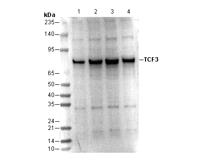 TCF3/TCF7L1 Antibody [G18A14] detects endogenous levels of total TCF3/TCF7L1 protein.