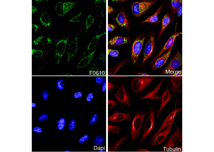 • Immunofluorescent analysis of Hela cells using F0610 (green, 1:100), Hoechst (blue) and tubulin (Red).