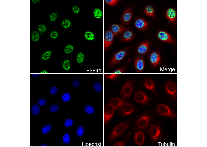 • Immunofluorescent analysis of U-87 MG cells using F3941 (green, 1:500), Hoechst (blue) and tubulin (Red).