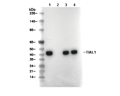 • Lane 1: HeLa, Lane 2: HeLa (KO TIAL1), Lane 3: Jurkat, Lane 4: K-562