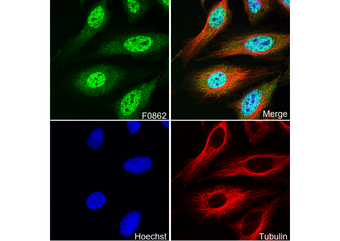 • Immunofluorescent analysis of Hela cells using F0862 (green, 1:800), Hoechst (blue) and tubulin (Red).