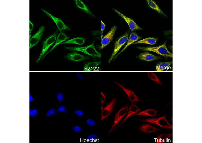 • Immunofluorescent analysis of Hela cells using F2122 (green, 1:200), Hoechst (blue) and tubulin (Red).