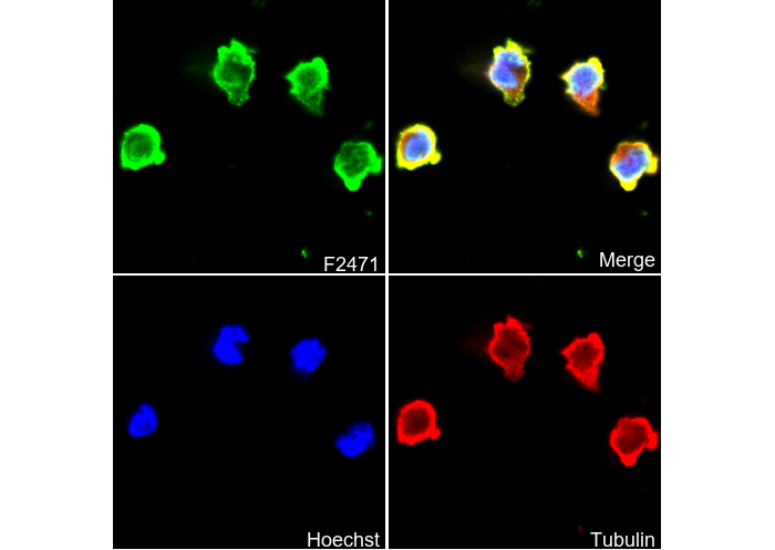 • Immunofluorescent analysis of THP-1 cells using F2471 (green, 1:400), Hoechst (blue) and tubulin (Red).