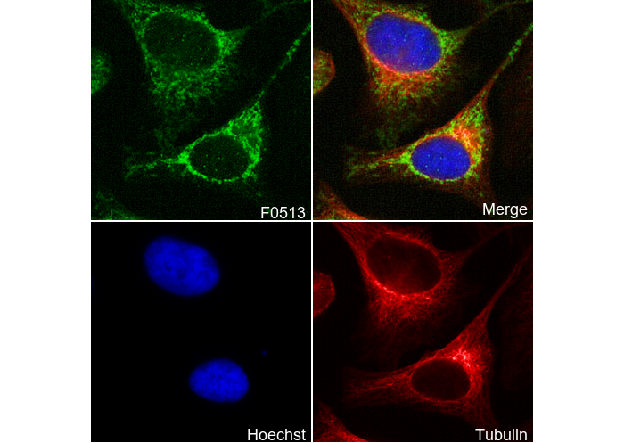 • Immunofluorescent analysis of Hela cells using F0513 (green, 1:100), Hoechst (blue) and tubulin (Red).