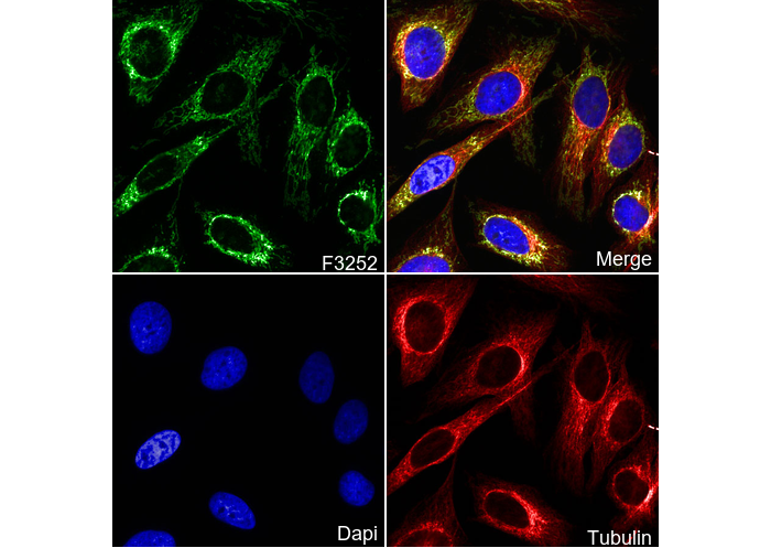 • Immunofluorescent analysis of Hela cells using F3252 (green, 1:250), Hoechst (blue) and tubulin (Red).