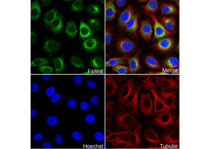 • Immunofluorescent analysis of A549 cells using F4866 (green, 1:50 ), Hoechst (blue) and tubulin (Red).
