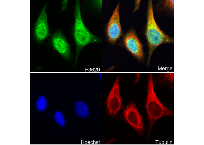 • Immunofluorescent analysis of Hela cells using F3629 (green, 1:200), Hoechst (blue) and tubulin (Red).