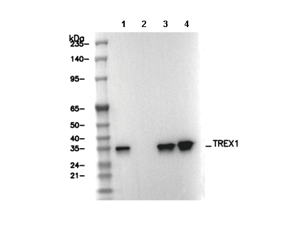 • Lane 1: A549, Lane 2: A549 (KO TREX1), Lane 3: Raji, Lane 4: Daudi