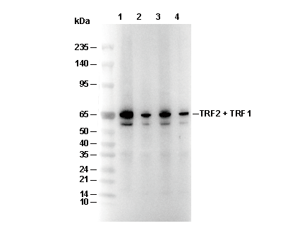 TRF2 + TRF1 Antibody [H1E11] detects endogenous levels of total TRF2 + TRF1 protein.