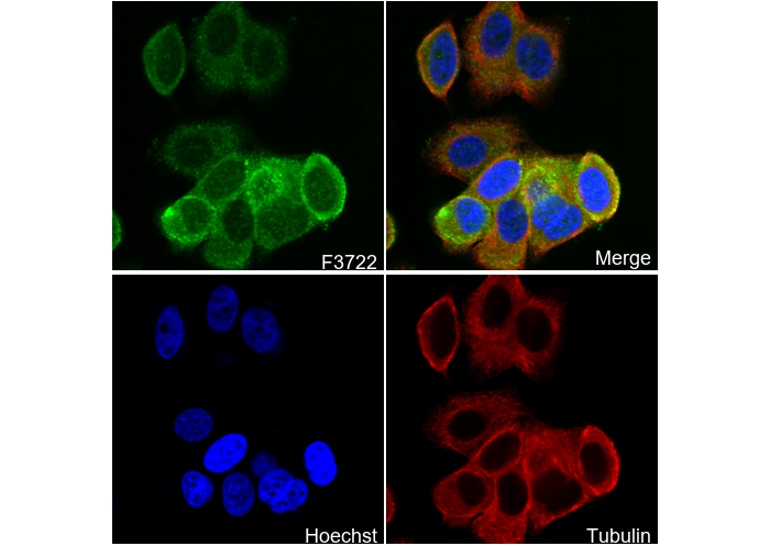 • Immunofluorescent analysis of MCF-7 cells using F3722 (green, 1:70), Hoechst (blue) and tubulin (Red).