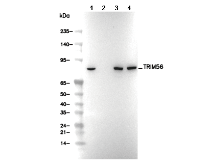 • Lane 1: A549, Lane 2: A549 (KO TRIM56), Lane 3: MCF7, Lane 4: A-375