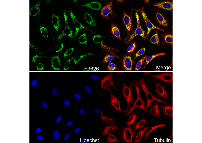 • Immunofluorescent analysis of Hela cells using F3626 (green, 1:100), Hoechst (blue) and tubulin (Red).