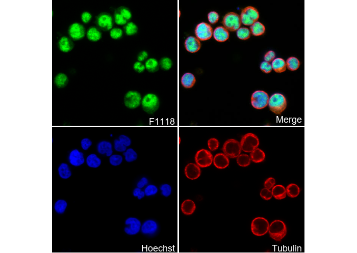 • Immunofluorescent analysis of Jurkat cells using F1118 (green, 1:100), Hoechst (blue) and tubulin (Red).