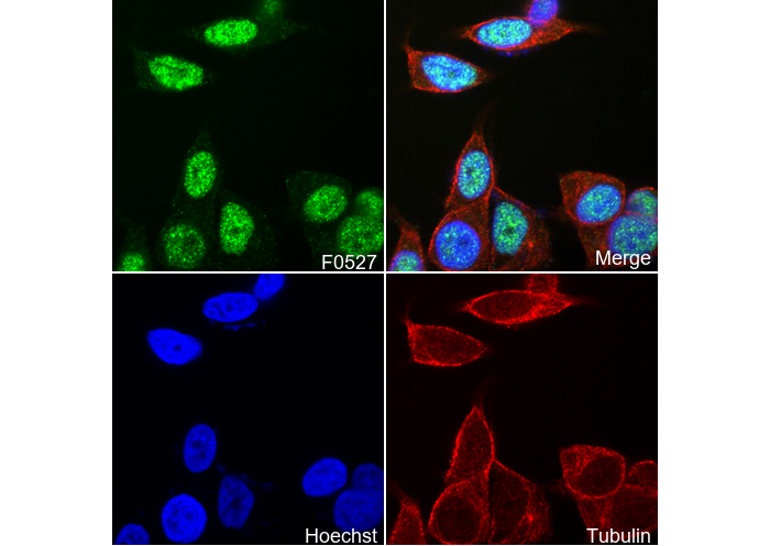 • Immunofluorescent analysis of MCF-7 cells using F0527 (green, 1:500), Hoechst (blue) and tubulin (Red).