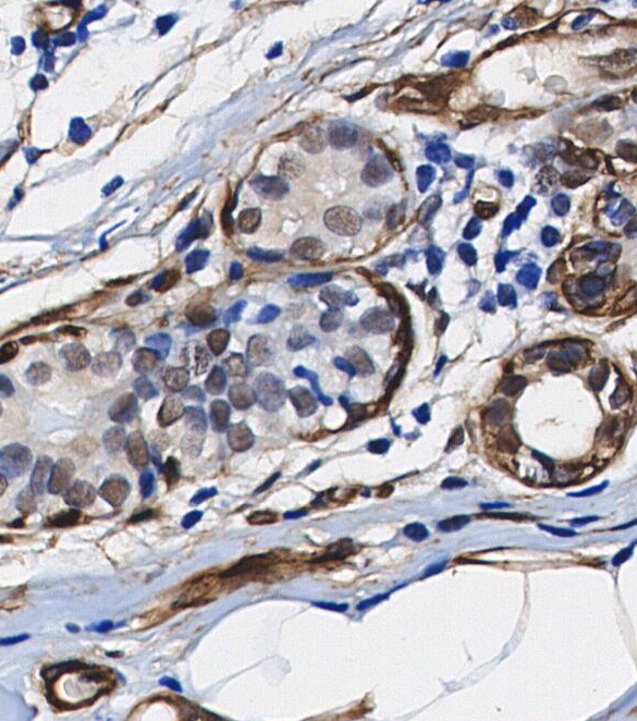 • Immunohistochemical analysis of formalin fixed paraffin embedded human Breast Cancer tissue with F0527 at 1/100 dilution.