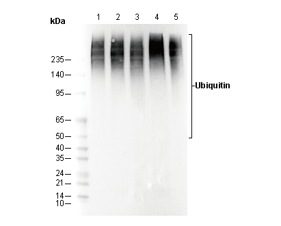 この抗体はLys48(K48)残基によって形成されるポリユビキチン鎖のみを認識するため、WB結果にテーリングという通常の現象が現れる場合があります。