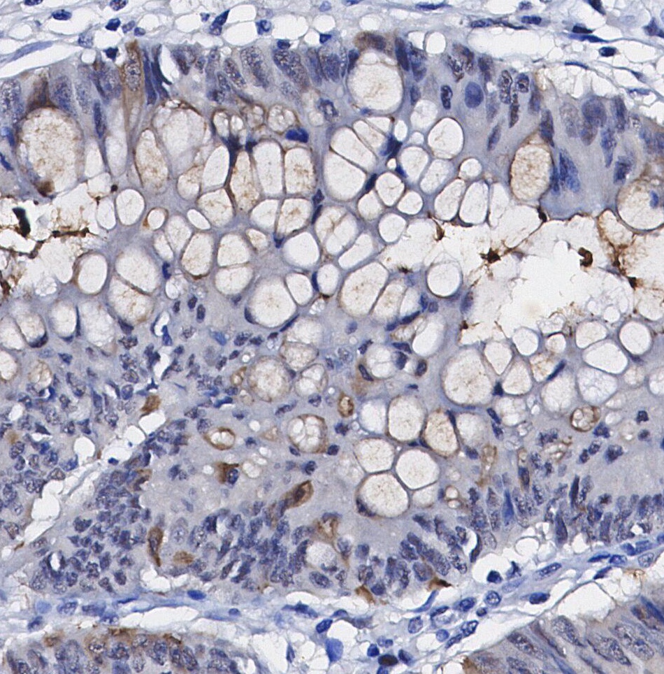 • Immunohistochemical analysis of formalin fixed paraffin embedded human Colorectal cancer tissue with F0528 at 1/100 dilution.