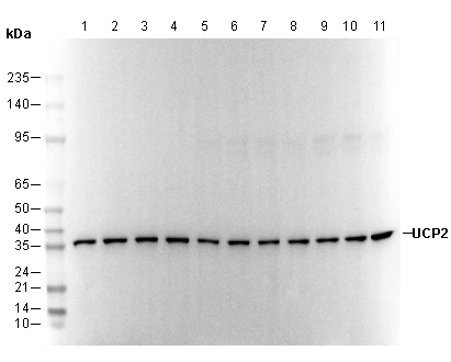 • Lane 1:Human adipocytes , Lane 2: KNRK , Lane 3: Raw264.7 , Lane 4: COS-7 , Lane 5: HT-29 , Lane 6: ACHN , Lane 7: Hela , Lane 8: Huh7 , Lane 9: 3T3 , Lane 10: C2C12 , Lane 11: Vero
