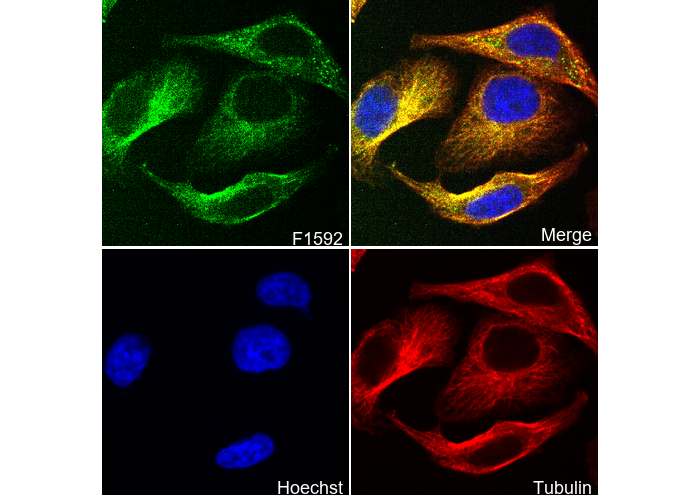 • Immunofluorescent analysis of HepG2 cells using F1592 (green, 1:300), Hoechst (blue) and tubulin (Red).