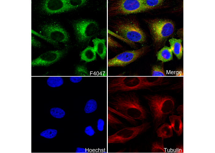 • Immunofluorescent analysis of Hela cells using F4047 (green, 1:70), Hoechst (blue) and tubulin (Red).