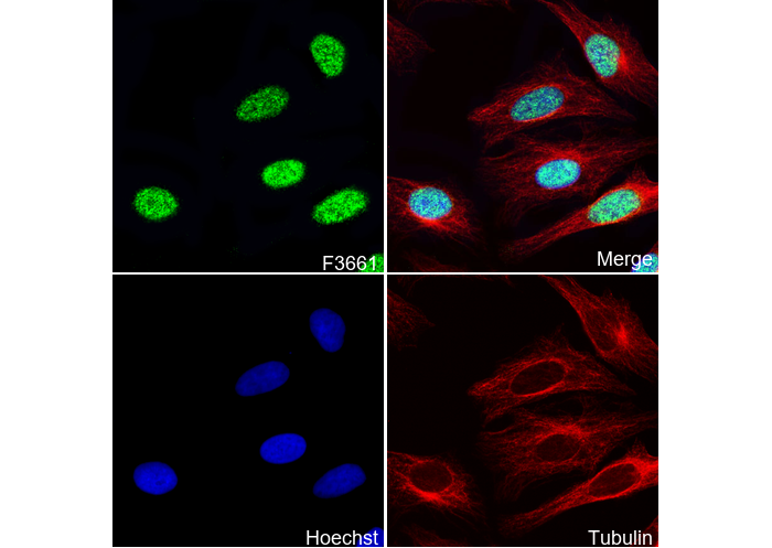 • Immunofluorescent analysis of Hela cells using F3661 (green, 1:100), Hoechst (blue) and tubulin (Red).