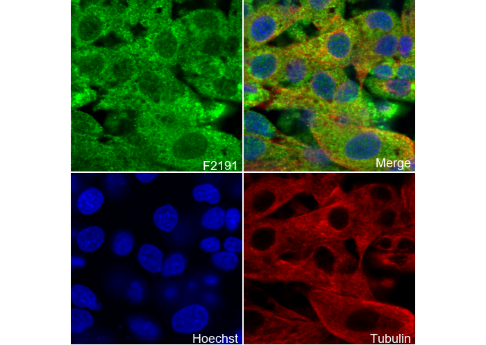 • Immunofluorescent analysis of PC12 cells using F2191 (green, 1:100), Hoechst (blue) and tubulin (Red).