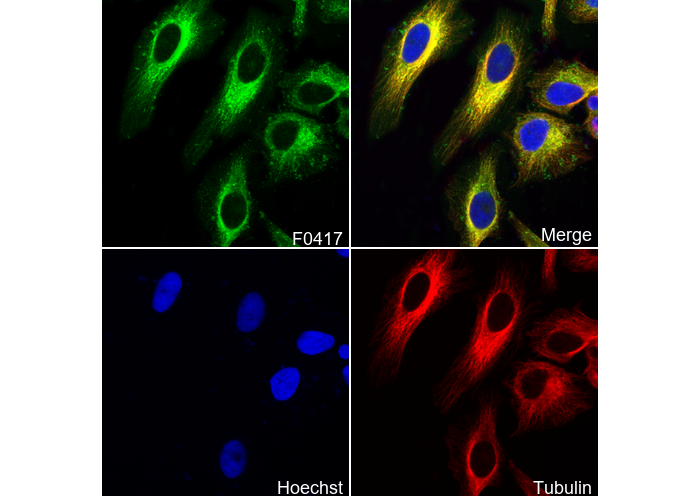 • Immunofluorescent analysis of Hela cells using F0417 (green, 1:400), Hoechst (blue) and tubulin (Red).