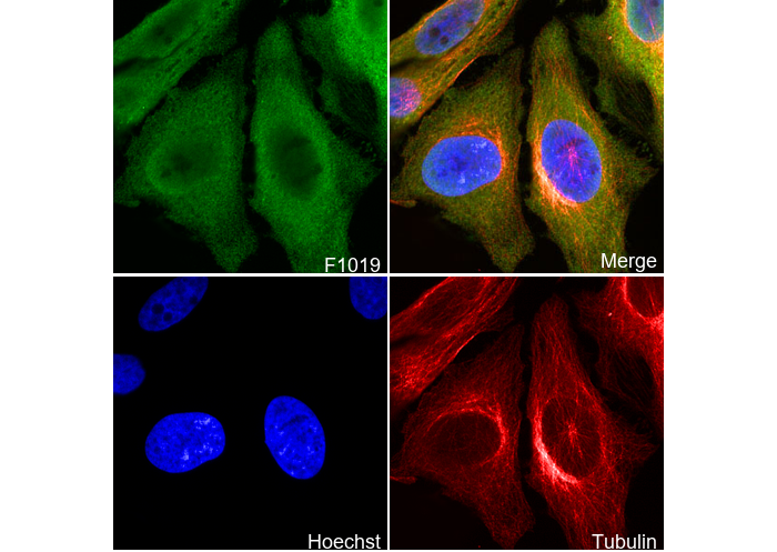 • Immunofluorescent analysis of Hela cells using F1019 (green, 1:500), Hoechst (blue) and tubulin (Red).