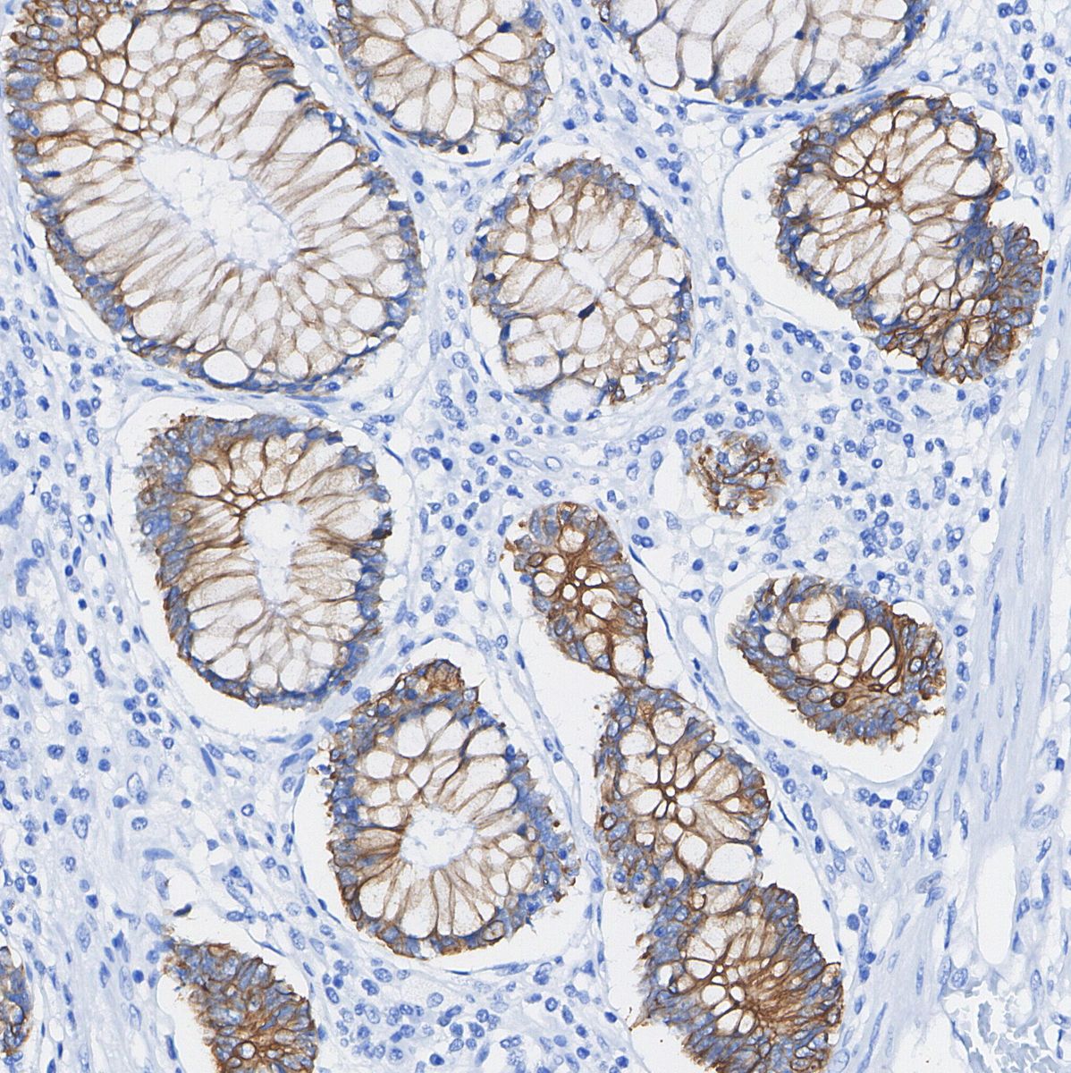 • Immunohistochemical analysis of formalin fixed paraffin embedded human Colorectal cancer tissue with F1598 at 1/100 dilution.