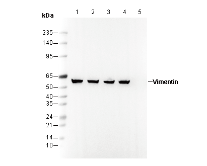 • Lane 1: NIH/3T3 , Lane 2: C6 , Lane 3: COS7 , Lane 4: HeLa , Lane 5: HeLa (koVimentin)
