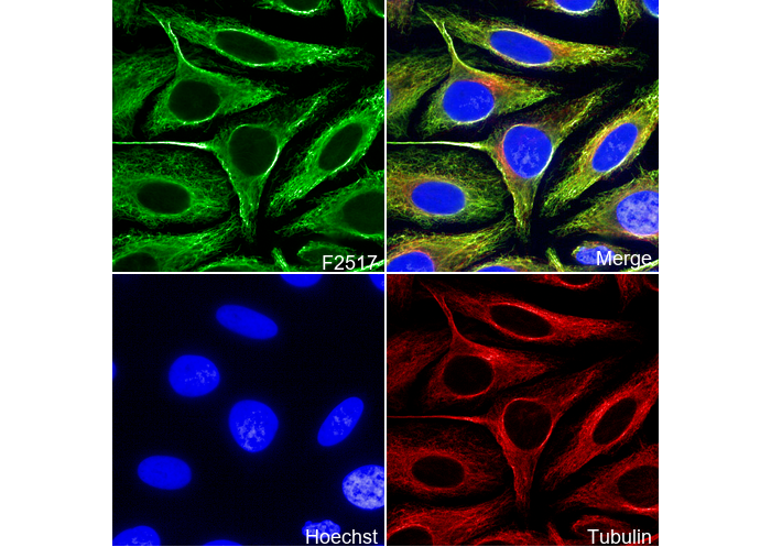 • Immunofluorescent analysis of Hela cells using F2517 (green, 1:250), Hoechst (blue) and tubulin (Red).