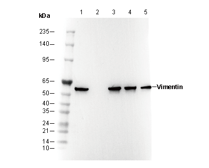 • Lane 1: A549 , Lane 2: A549 (KO VIM) , Lane 3: HeLa , Lane 4: HEK293 , Lane 5: Jurkat