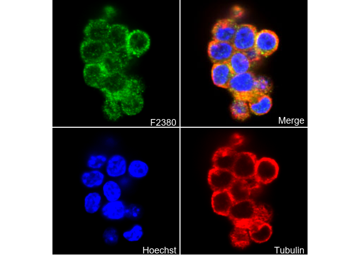 • Immunofluorescent analysis of RAW264.7 cells using F2380 (green, 1:50), Hoechst (blue) and tubulin (Red).