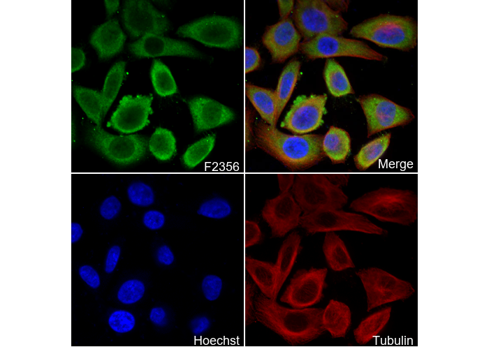 • Immunofluorescent analysis of HepG2 cells using F2356 (green, 1:50 ), Hoechst (blue) and tubulin (Red).