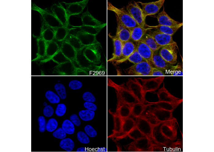 • Immunofluorescent analysis of 293T cells using F2969 (green, 1:2550), Hoechst (blue) and tubulin (Red).