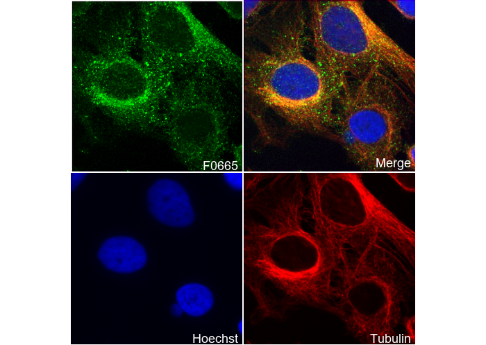 • Immunofluorescent analysis of Hela cells using F0665 (green, 1:50), Hoechst (blue) and tubulin (Red).