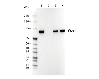 Wee1 Antibody [K14K15] recognizes endogenous levels of total Wee1 protein.