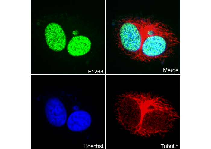 • Immunofluorescent analysis of MCF-7 cells using F1268 (green, 1:800), Hoechst (blue) and tubulin (Red).